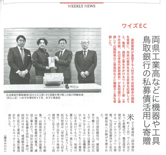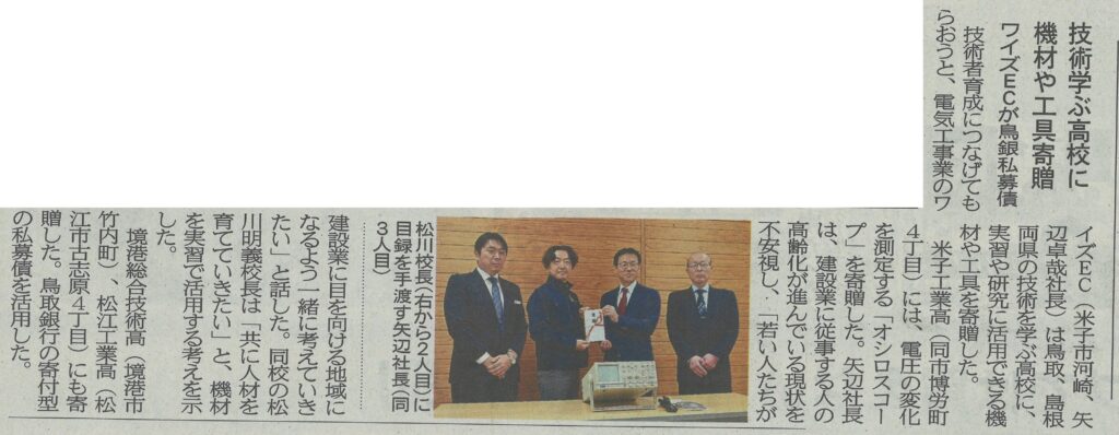 「ワイズEC」が高校に寄附 「とりぎんSDGSふるさと未来応援債」の手数料の一部を活用 約10万円相当の電子電圧計を贈呈 鳥取県境港市