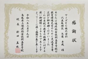 それに伴いまして、2月19日、20日と寄贈品の贈呈式を行いました。境港総合高校様からは恐れ多くも、感謝状を頂きました。誠にありがとうございました。